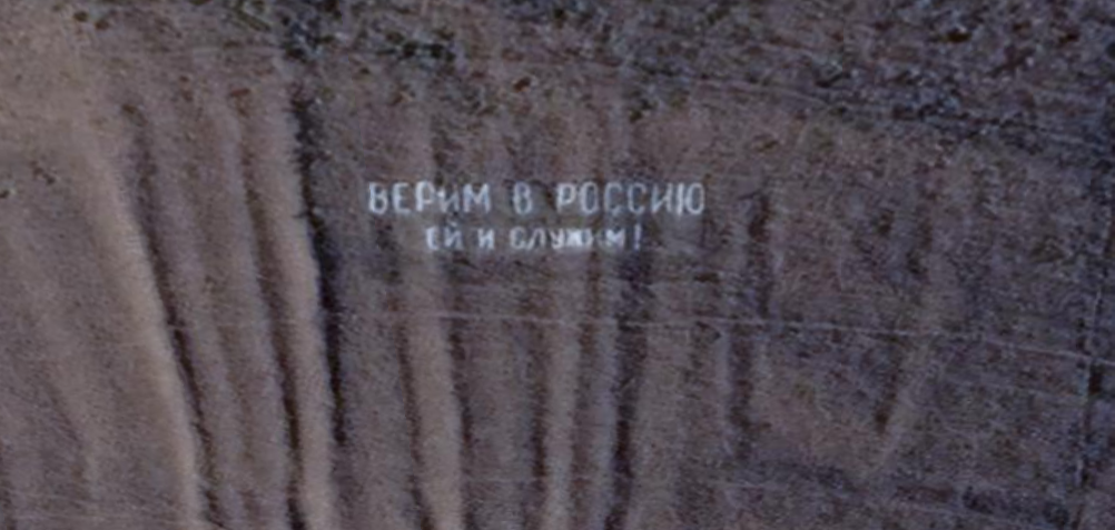 Writing on the territory of the Torgim training ground (in Russian) – “верим в россию, ей и служим!”, which translates to “We trust in Russia, and her we do serve!”